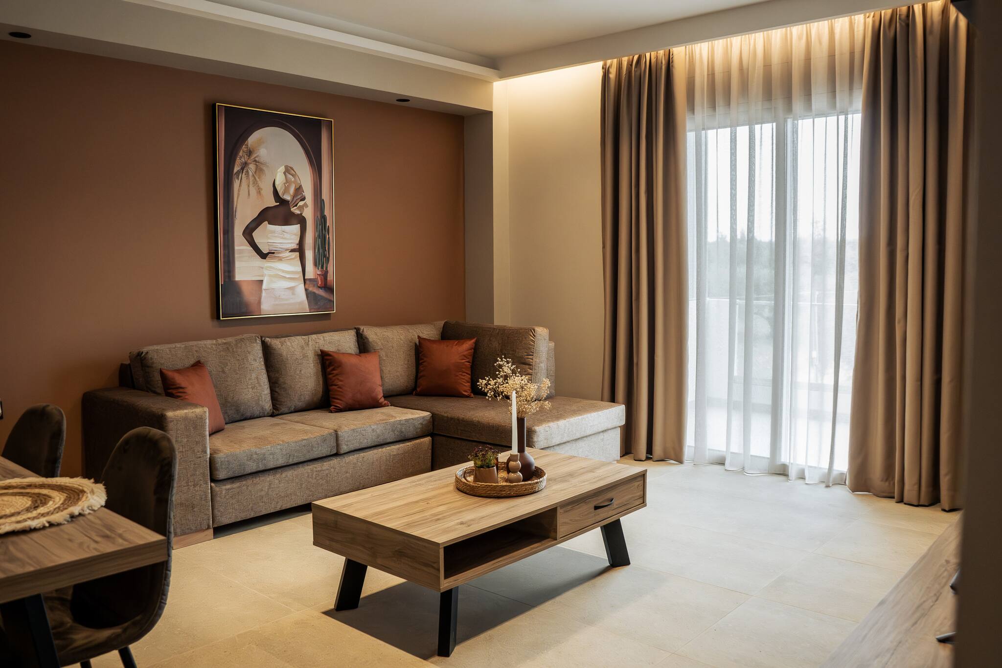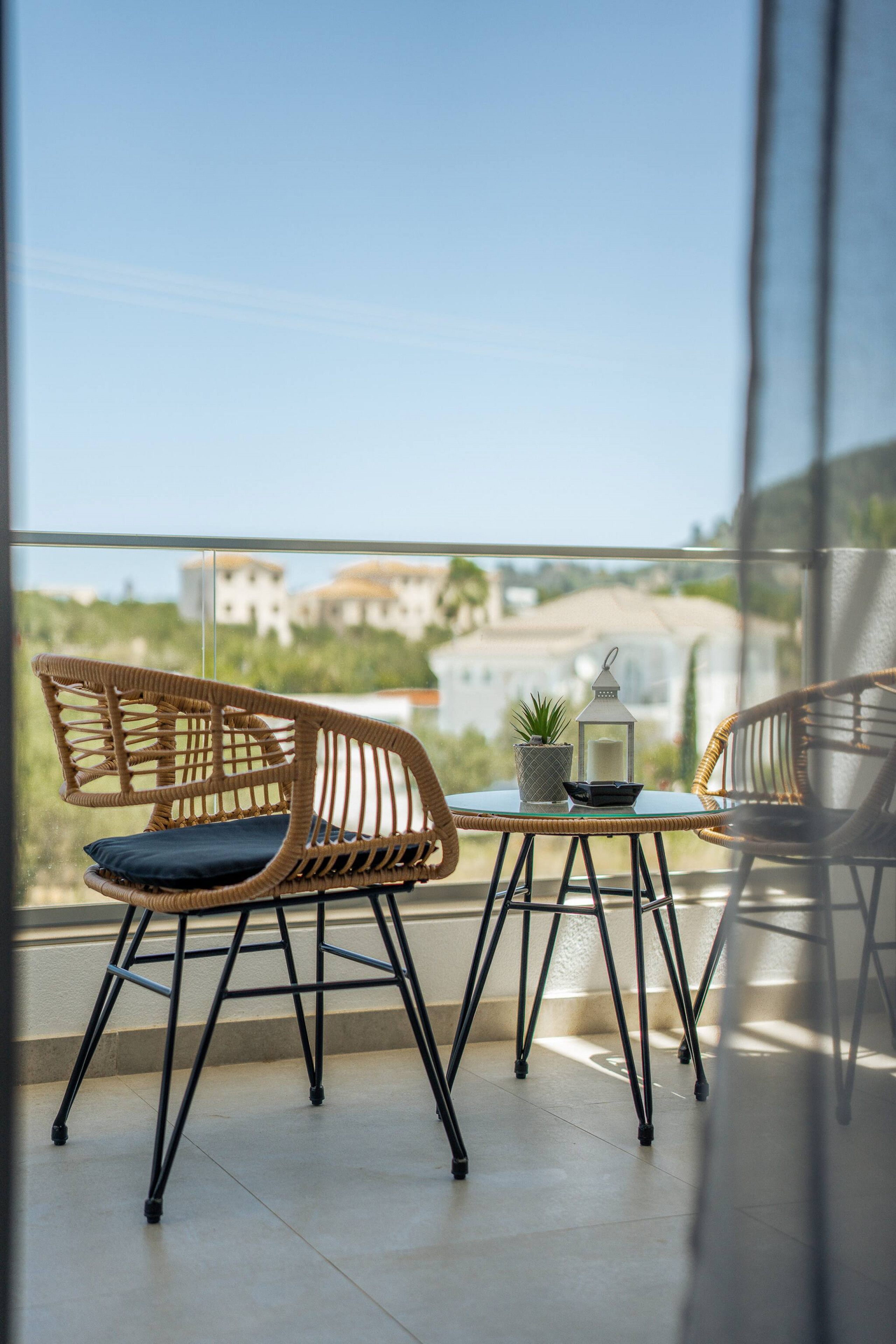 The apartment also features a balcony, complete with two chairs and a side table, providing a charming outdoor space where guests can enjoy their morning coffee or soak up the sun.