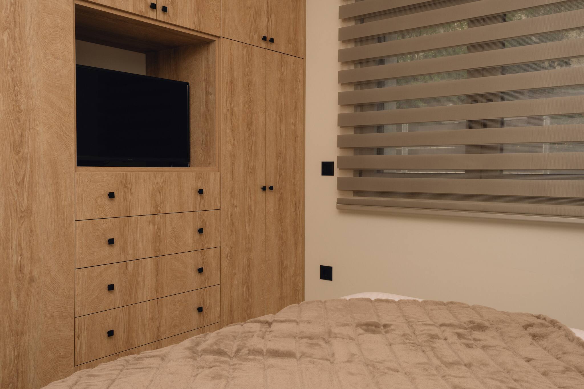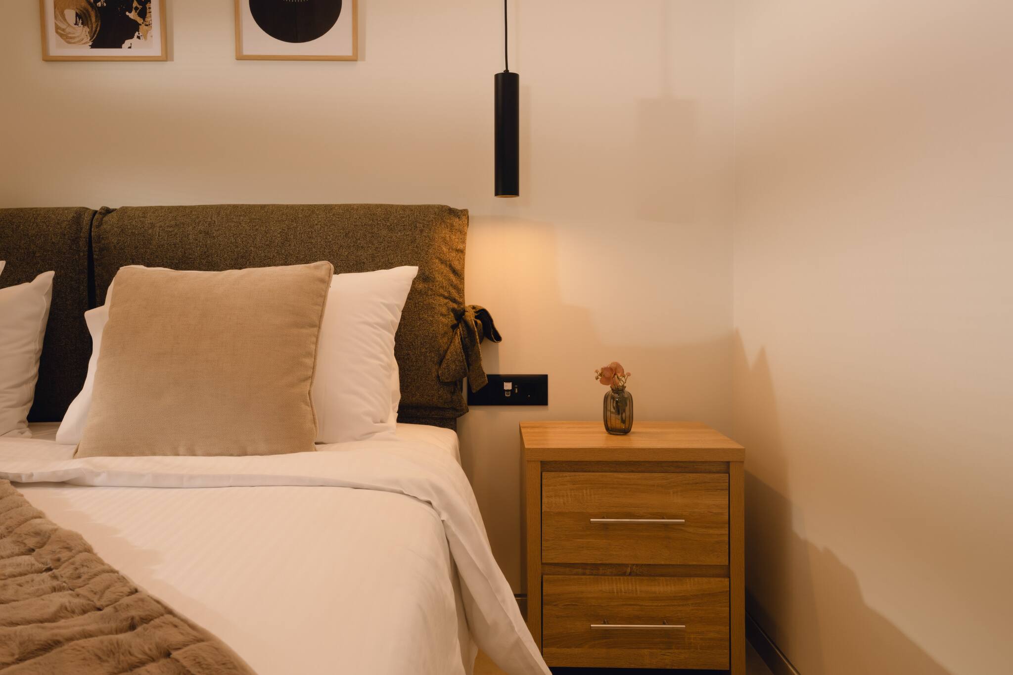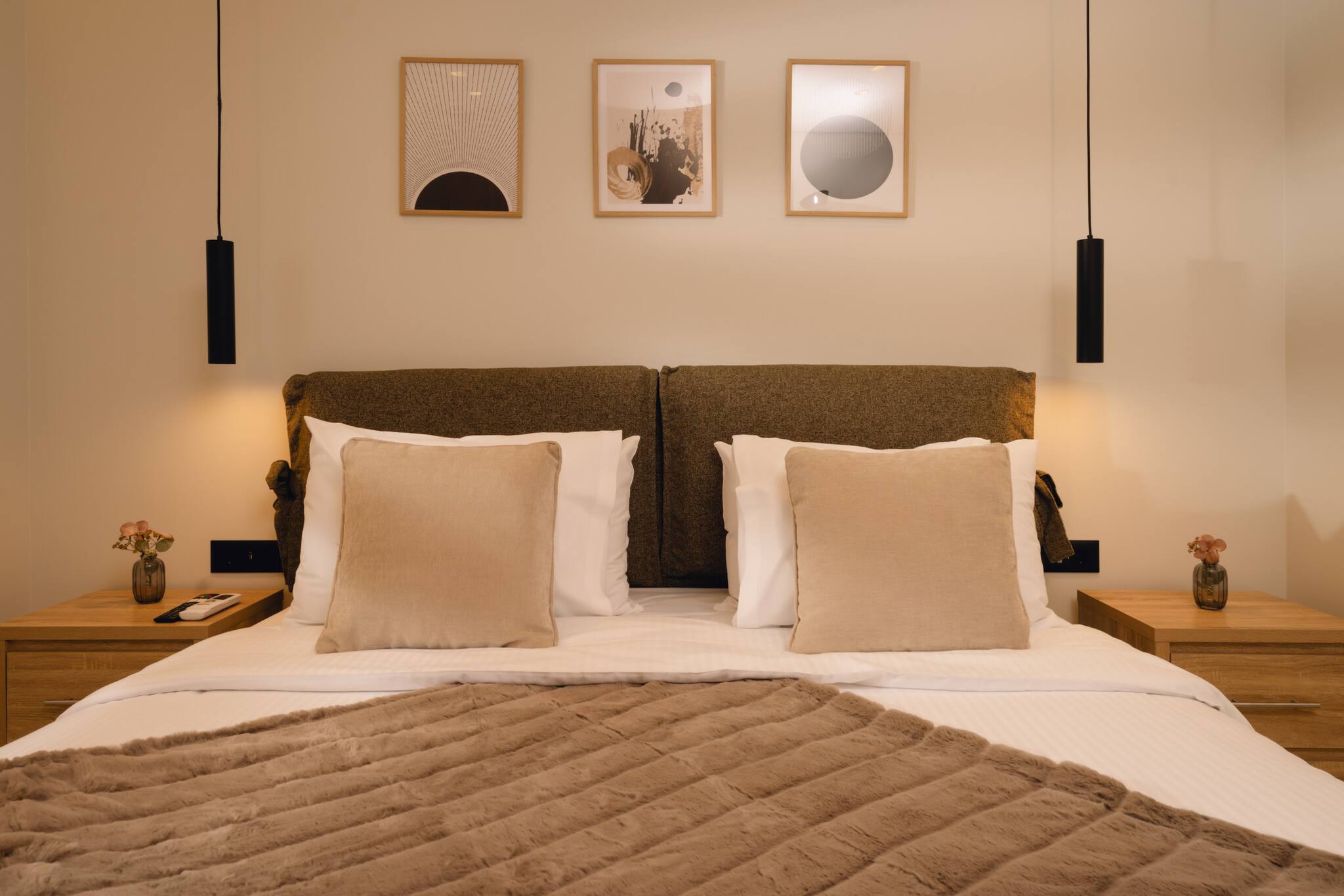 The first bedroom boasts a spacious layout with a cozy king size 180x200 mattress. The room is tastefully decorated with modern furnishings, including bedside tables, lamps, and a wardrobe for your convenience, and an En - suite bathroom. The second bedroom is equally inviting, featuring a generous king size 180x200 mattress that promises utmost comfort. You'll find ample storage space with a wardrobe and additional amenities to make your stay as comfortable as possible. The third bedroom is perfect for solo travelers or children, with a comfortable two beds with 90x200 mattresses (can convert as a double bed upon request).