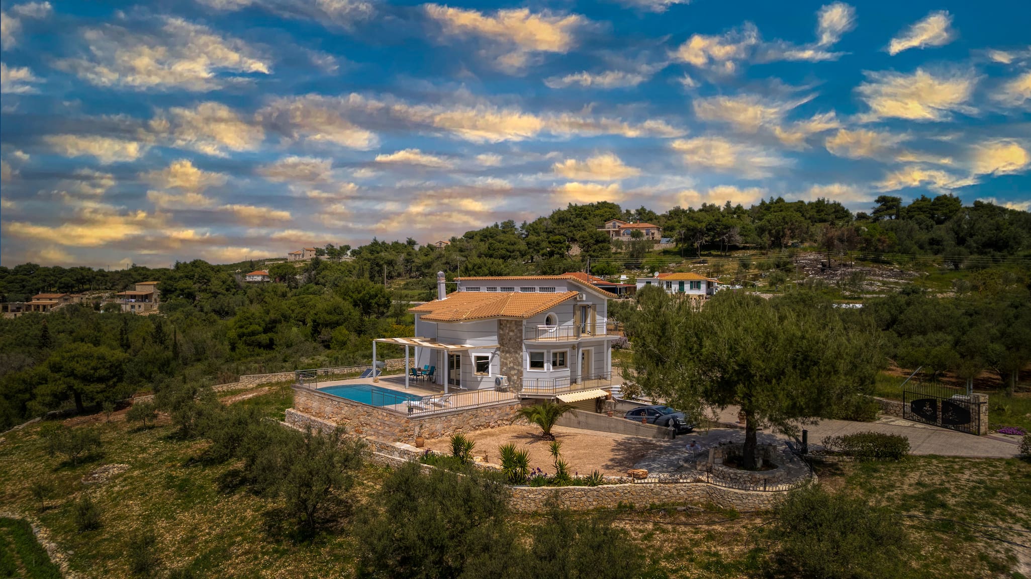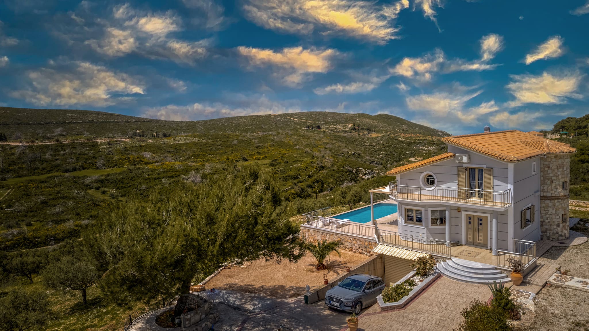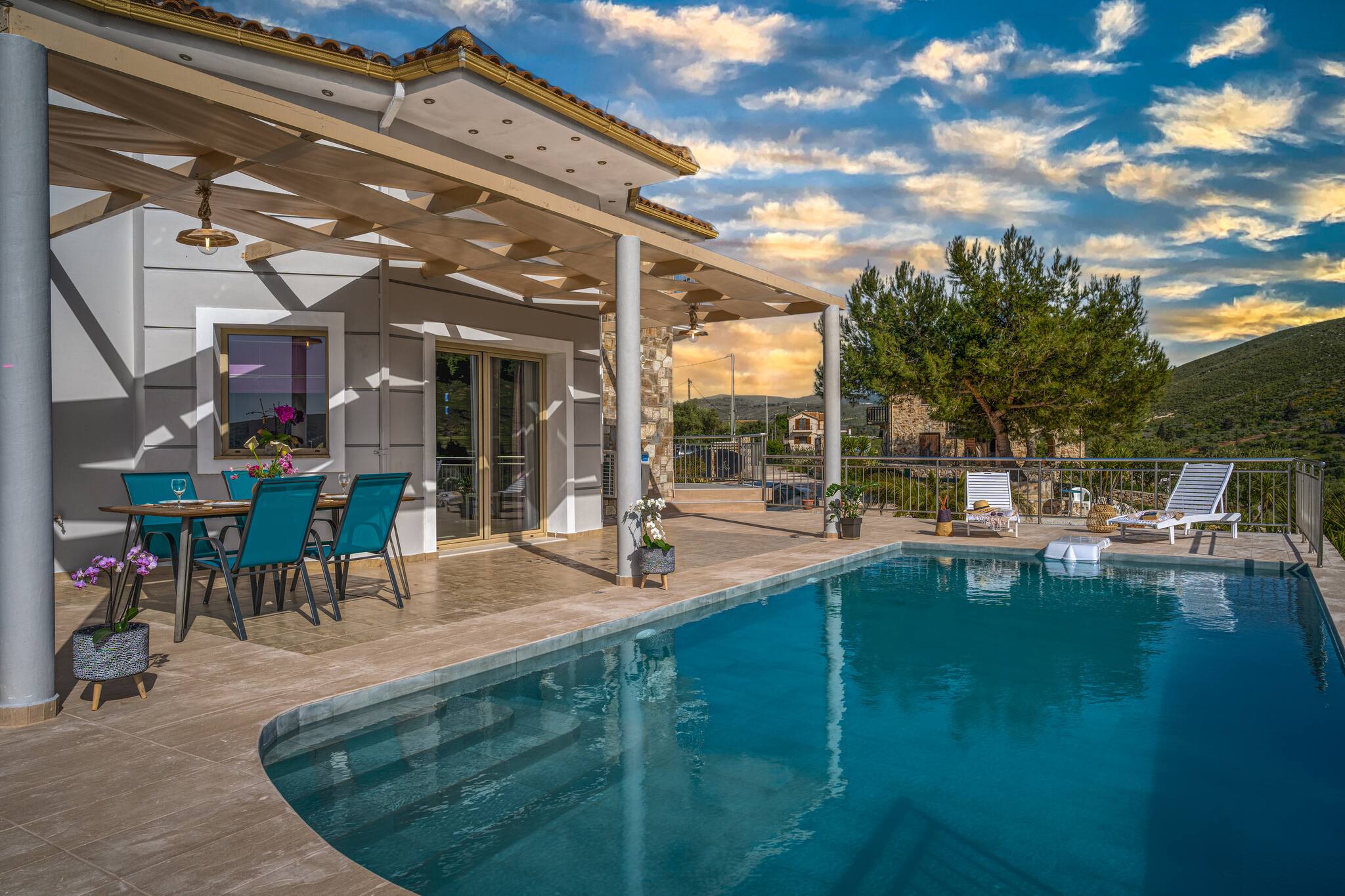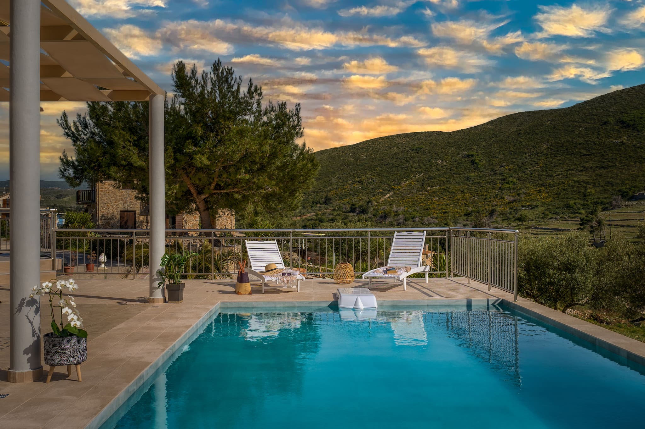 On the ground floor there is the kitchen, the dining room, the living room, one bathroom with a bathtub and the first bedroom with a double bed. The first floor includes 2 bedrooms, one with a double bed, one with two single beds and the shared bathroom with a shower. In addition, there is a kitchen, fully equipped for any meal preparation accompanied from the sitting area. Along with the kitchen, there is a spacious living room with plenty of sitting areas with modern furniture and bookcases. Guests will find a screen TV and free Wi-Fi access throughout the property. From the balcony on the ground floor, you can enjoy the breathtaking view of the mountain, meeting the endless horizon. Outdoors, there is the breathtaking private swimming pool and sunbeds that will offer the best setting for unforgettable leisure time under the sun. There is a BBQ facility to enjoy a gathering with your loved ones as well as a sitting area.