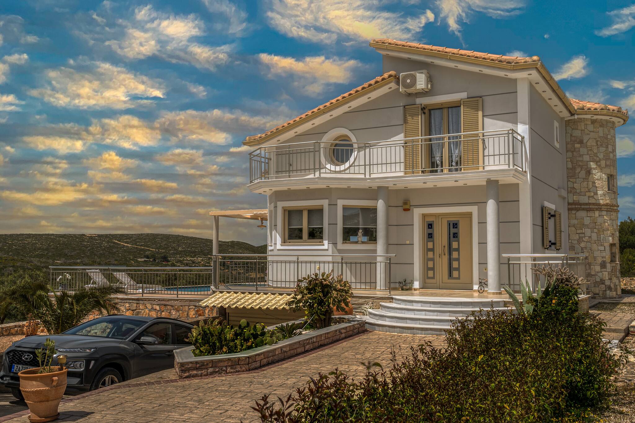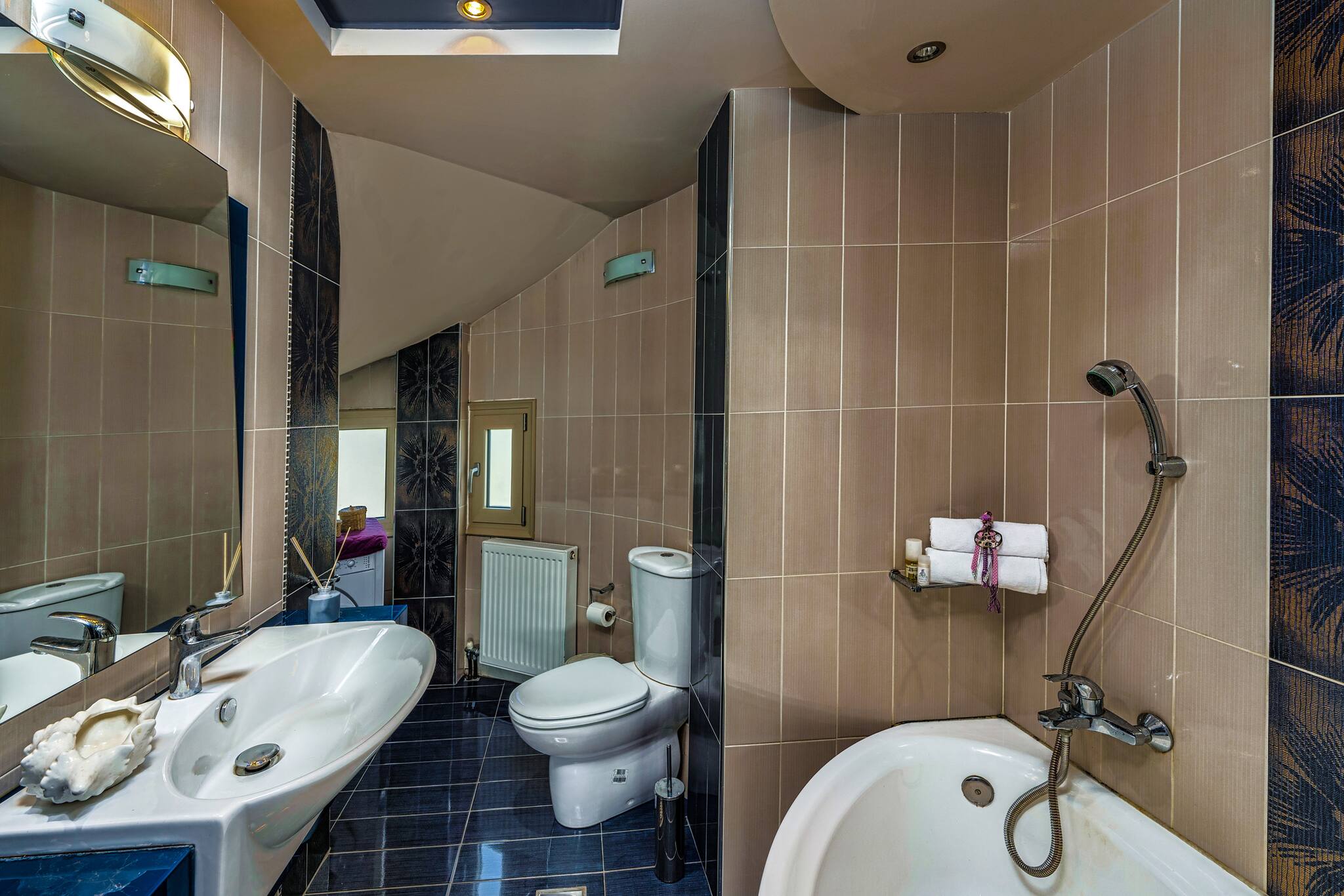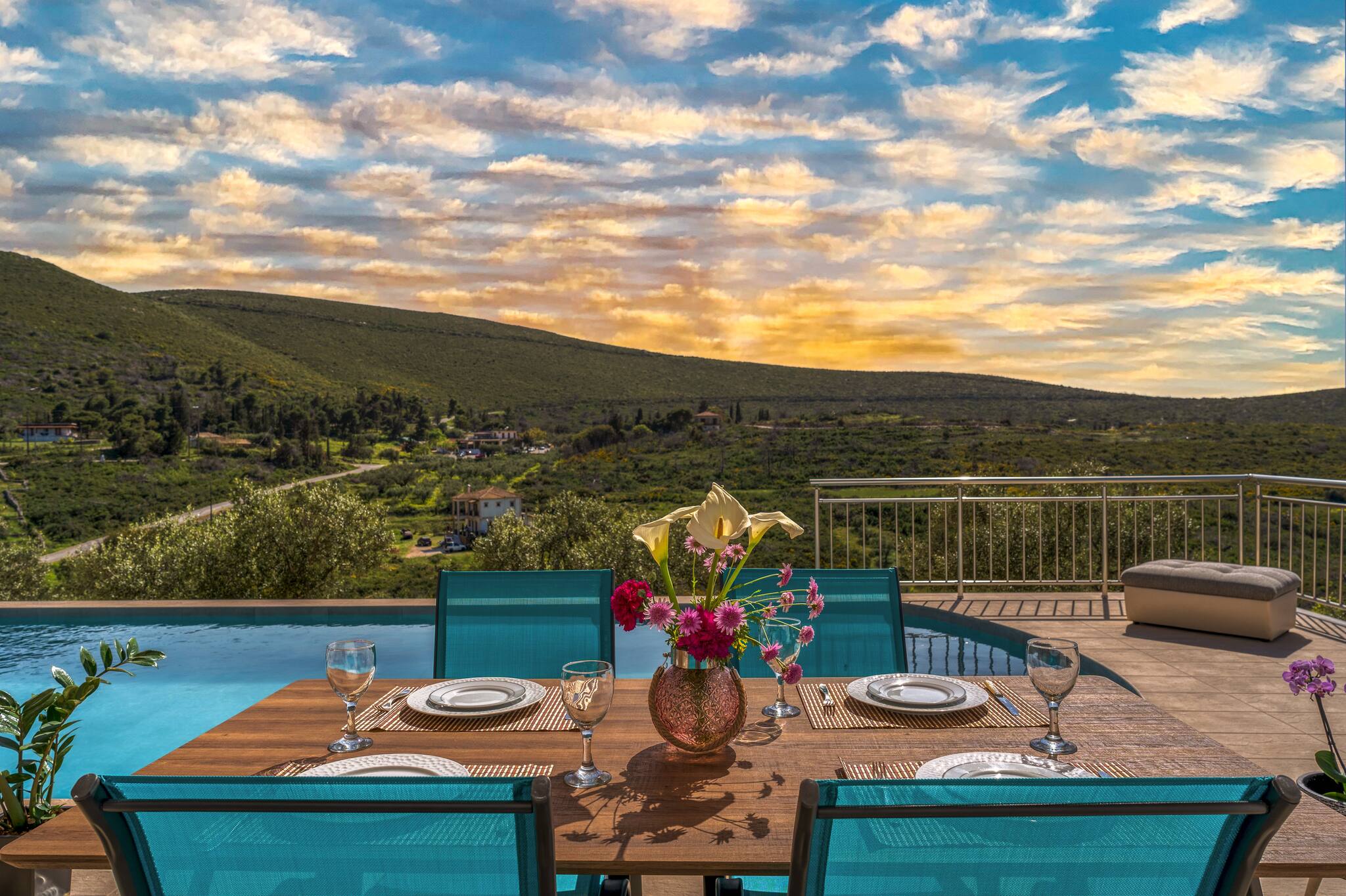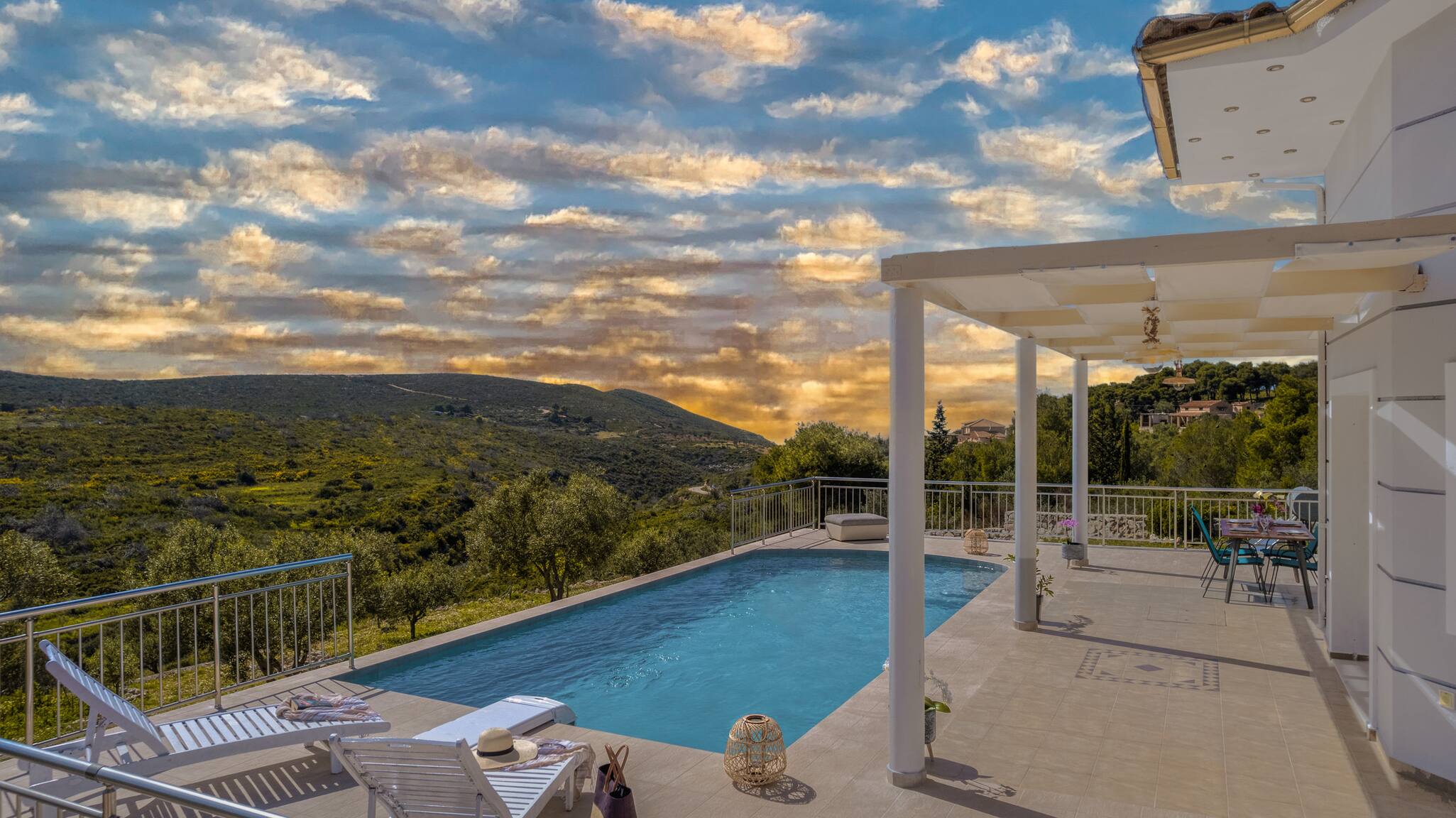 On the ground floor there is the kitchen, the dining room, the living room, one bathroom with a bathtub and the first bedroom with a double bed. The first floor includes 2 bedrooms, one with a double bed, one with two single beds and the shared bathroom with a shower. In addition, there is a kitchen, fully equipped for any meal preparation accompanied from the sitting area. Along with the kitchen, there is a spacious living room with plenty of sitting areas with modern furniture and bookcases. Guests will find a screen TV and free Wi-Fi access throughout the property. From the balcony on the ground floor, you can enjoy the breathtaking view of the mountain, meeting the endless horizon. Outdoors, there is the breathtaking private swimming pool and sunbeds that will offer the best setting for unforgettable leisure time under the sun. There is a BBQ facility to enjoy a gathering with your loved ones as well as a sitting area.