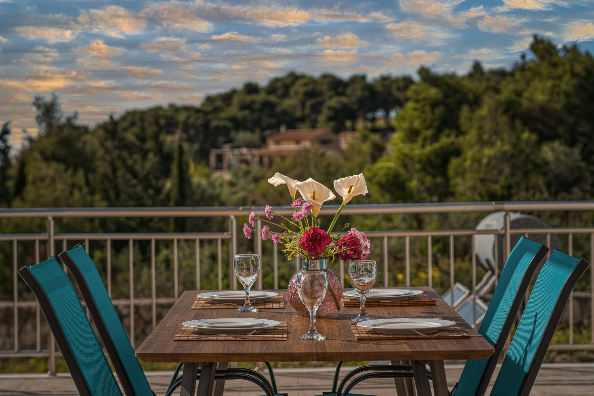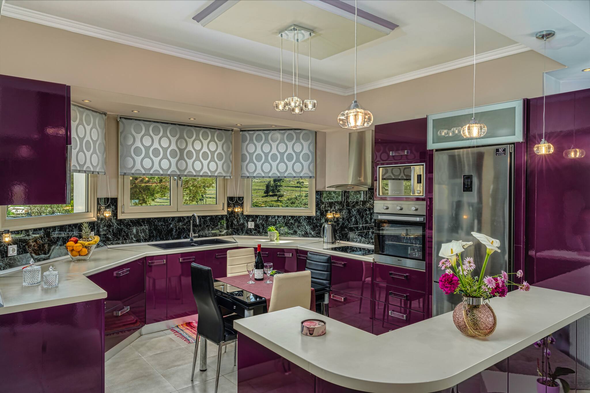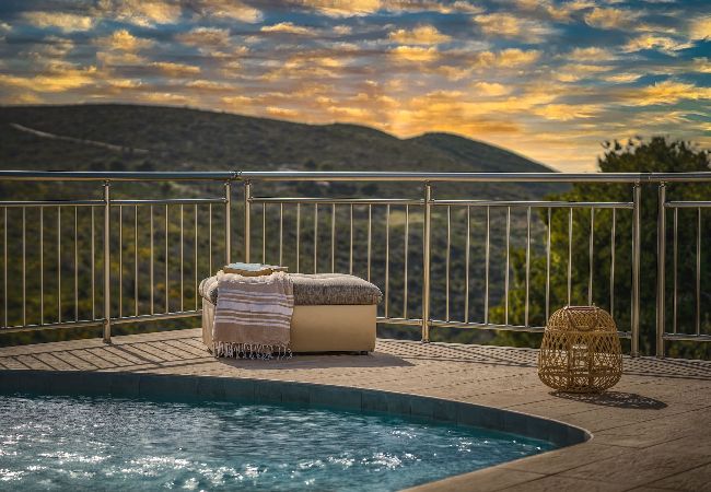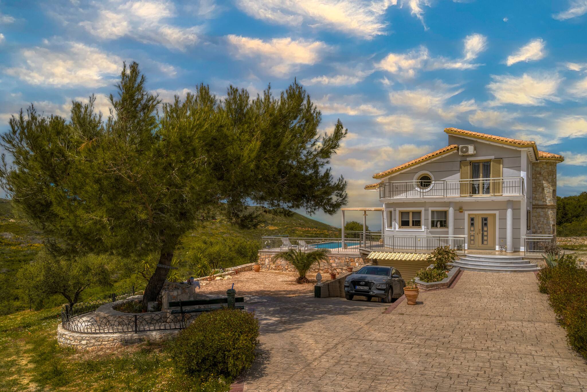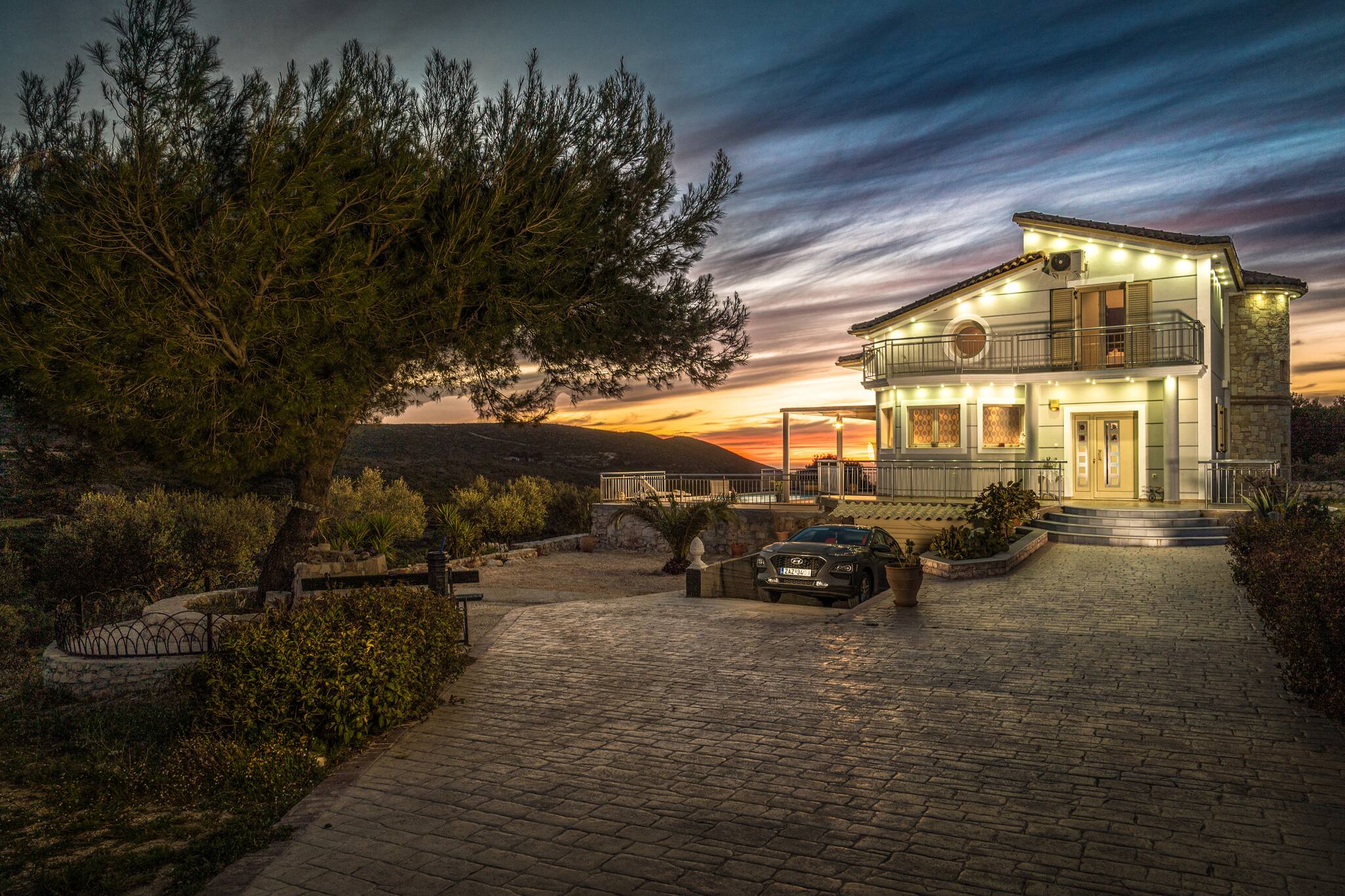 On the ground floor there is the kitchen, the dining room, the living room, one bathroom with a bathtub and the first bedroom with a double bed. The first floor includes 2 bedrooms, one with a double bed, one with two single beds and the shared bathroom with a shower. In addition, there is a kitchen, fully equipped for any meal preparation accompanied from the sitting area. Along with the kitchen, there is a spacious living room with plenty of sitting areas with modern furniture and bookcases. Guests will find a screen TV and free Wi-Fi access throughout the property. From the balcony on the ground floor, you can enjoy the breathtaking view of the mountain, meeting the endless horizon. Outdoors, there is the breathtaking private swimming pool and sunbeds that will offer the best setting for unforgettable leisure time under the sun. There is a BBQ facility to enjoy a gathering with your loved ones as well as a sitting area.